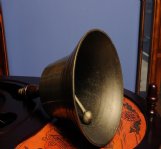 L: 8 W: 8 H: 11.5 Inches This brass bell was originally used on cruised ships to signal for meal time. When struck the bell sounds off clear and distinct. It comes with a wooden handle in an antique brass finish. The item dimensions are: L: 8 inches, W: